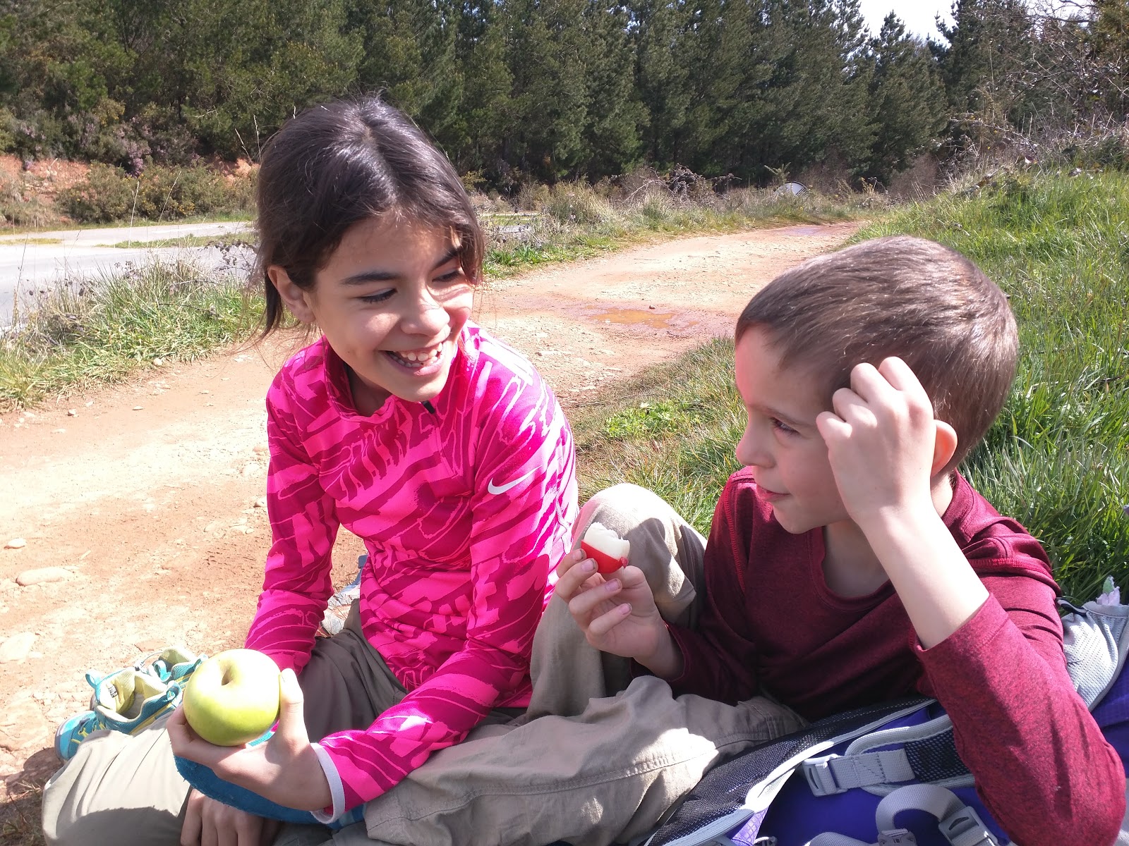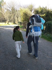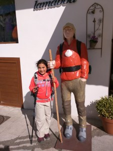José has been helping Mia with her pack when she gets worn out. He throws it on top of his and snaps the chest strap so it’s easy to get off and on. I’m not sure how he’s doing it since I know his left shoulder is already bothering him. When he dislocated his shoulder a couple years ago, it caused premature arthritis in the joint that he’s had to treat with cortisone shots. Lately he’s been taking glucosamine/chrondroitin supplements to help it. Mia usually only lets him carry it for a kilometer or two and then she demands that he give it back to her. Mia hasn’t really complained of anything so far. We try to let her set the pace as much as possible since she has the shorter legs but she just gallops all over on her invisible horse. She’s been staying in great spirits and we take breaks when she says so.