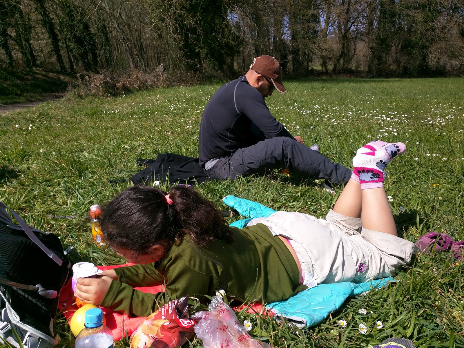 Every statue is an opportunity for Mia to express herself and there are lots of opportunities along the Camino. The weather has remained perfect for the most part with sunny skies and light breezes and not too hot. We were climbing a long hill when we hit the halfway mark today so we decided to wait until we reached the top before stopping for our lunch break. Nobody wants to start climbing with a full belly. Heck, who likes to walk at all on a full belly?! Mia picked out the perfect meadow covered in white daisies and we all plopped down for our lunch break. We pulled out the food from the grocery store and enjoyed another lunch of fruit, yogurt, nuts, bread and gouda, and cheese. Everyone lied down on their coats and wiggled their toes and soaked up the sunshine. We usually stop for about half an hour so our feet can rest and we can relax our stiff muscles. Mia and I slipped behind a tree in the middle of the meadow to take care of business after lunch. The only bathrooms along the Camino are located in cafes and you have to be a paying customer to use the majority of them. I carry two baggies in the top of my pack; one baggie contains a roll of toilet paper and the second baggie contains the used paper and I empty that out every evening. The new foods in our diets have been causing a little fun so we have to frequently stop and hunt for a bush and a break in the foot traffic to take care of business.