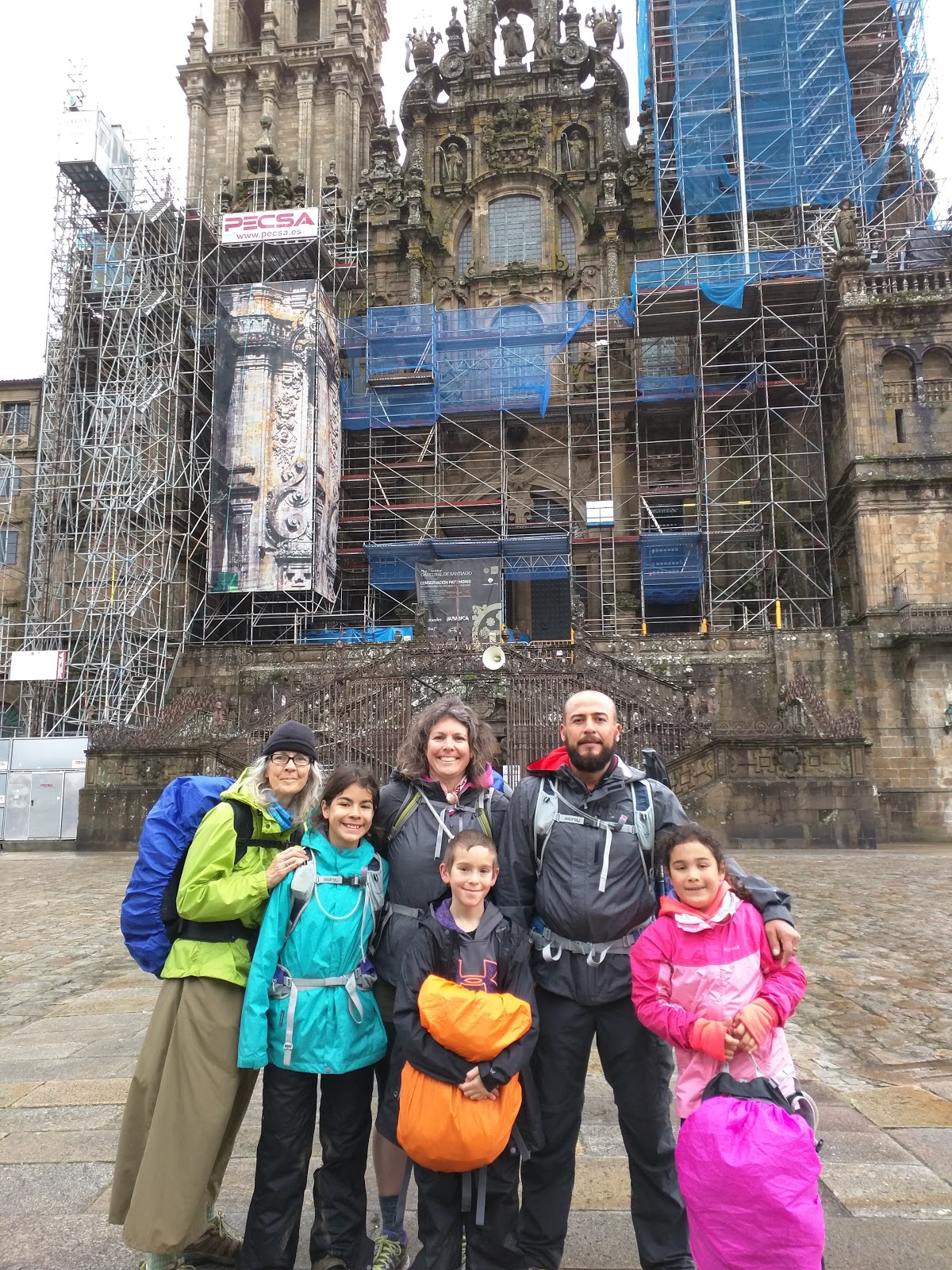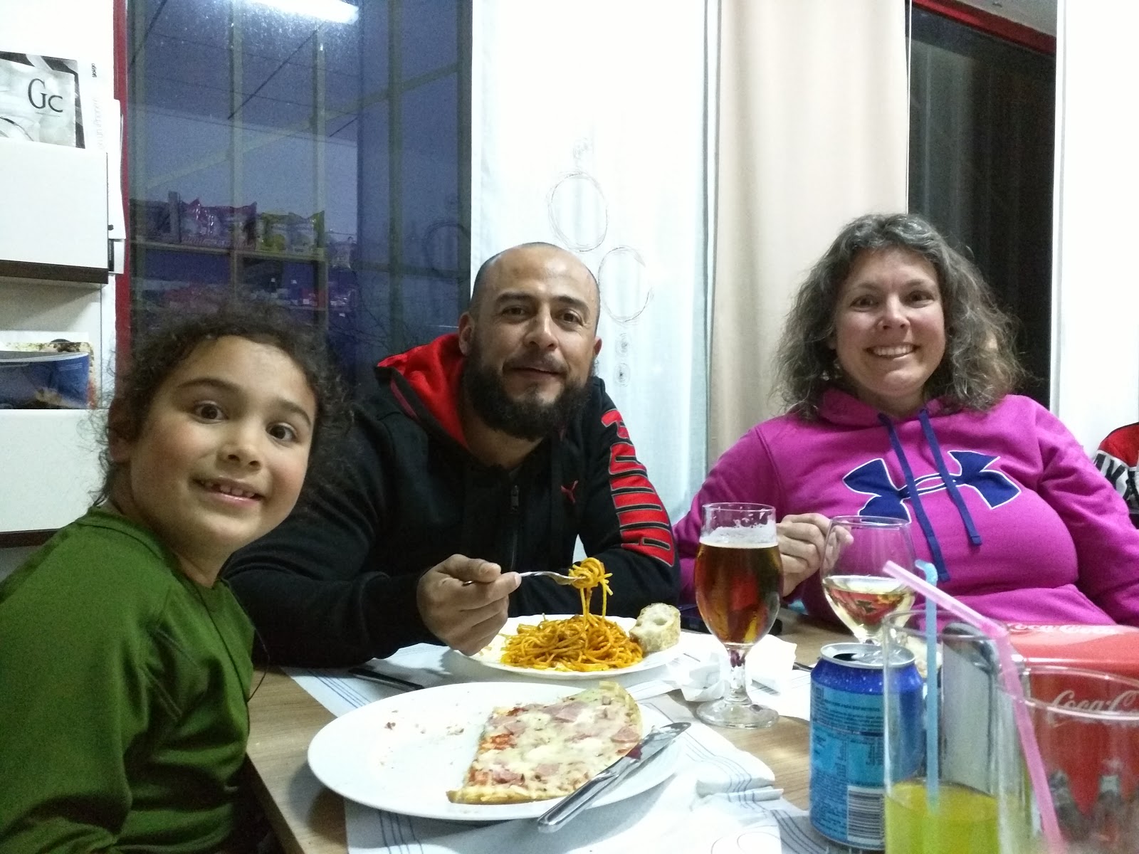 Mom texts me every so often with the number off the lastest kilometer marker so we have an idea how far back they are. I guess Mom got a lovely blister and stopped to pull out her first aid kit, Erika was feeling pretty despondent, and Justin was having a hard time. Mia and I decided to backtrack and meet up with them and help them make it into town. We walked back about a mile and found them as they were crossing the bridge on the outskirts of town. I put Justin on my shoulders with his pack on his back and Mia took Erika’s backpack from her. We very slowly walked back to the albergue. Once we reached the room, all three of the kids just dropped to the floor and pretty much didn’t move again for the rest of the night. Mom accompanied Jose and I to a pizza/pasta restaurant we had seen in town and we ordered our meals to go. Somehow our order got messed up and no meal was prepared for me. I didn’t feel like waiting around so we headed back to feed the kids anyway. José went downstairs to the restaurant next door and ordered me a pasta dish. I later found out that he enjoyed a beer and his soccer game while waiting for my meal so he wasn’t suffering too bad.