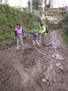 We had a beautiful walk today with great weather. It’s cool in the morning but when the sun comes out and starts shining, there is a little breeze so I am wearing an Under Armour tee and hoodie along with a Columbia hiking pant with built in skirt. We came around one corner in the trail and came across a bovine traffic jam. The old man was behind them herding but it is still a little unnerving as a lot of these cows have a set of horns on their head, not to mention, they outweigh us! Thankfully, they kept to their business and went right on by us with no hiccups. We found a beautiful viewpoint with a meadow on the side of the trail about the 12km mark and called it lunchtime. We laid our raincoats out on the grass and pulled out our foods. We ate fruit, crackers and Babybel, granola bars, nuts, you name it.