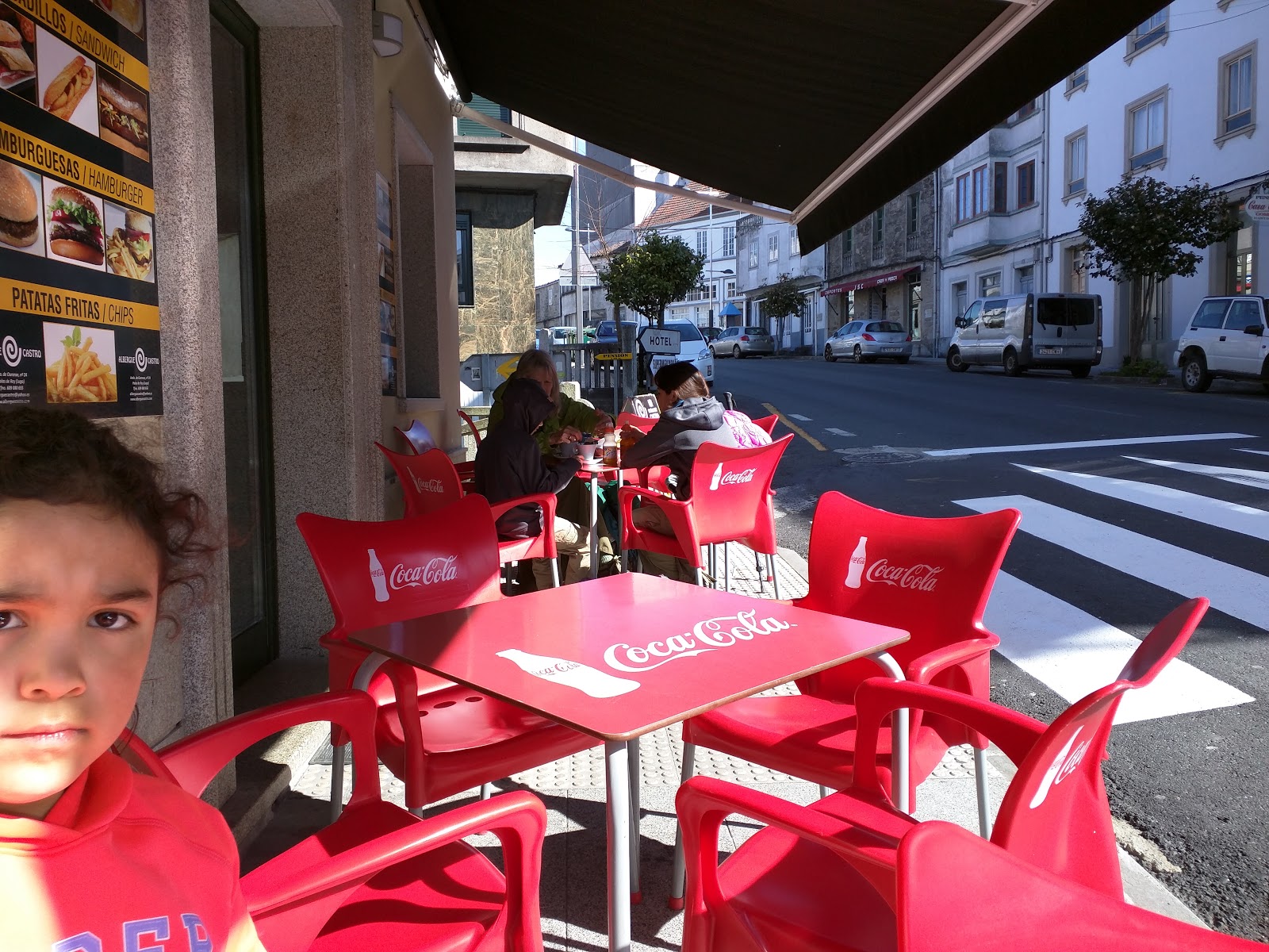 We all ordered the menu special which was a drink, pork chops, French fries, egg over easy, and dessert for 9€. The sopa fideo was served in a large bowl and José served us individually. It was delicious but then again, everything is when you’re hungry. We stayed and waited for JEJ to catch up with us. I pulled out Mia’s monocular and we watched the tiny pilgrims across the valley and we could pick them out as they crested the top. We waited long enough to help them order and get their food before we headed out. They also ordered the same meal with the exception of Mom who got a whole tortilla de patata (8€). After this Camino, she’ll probably never want to see one again!