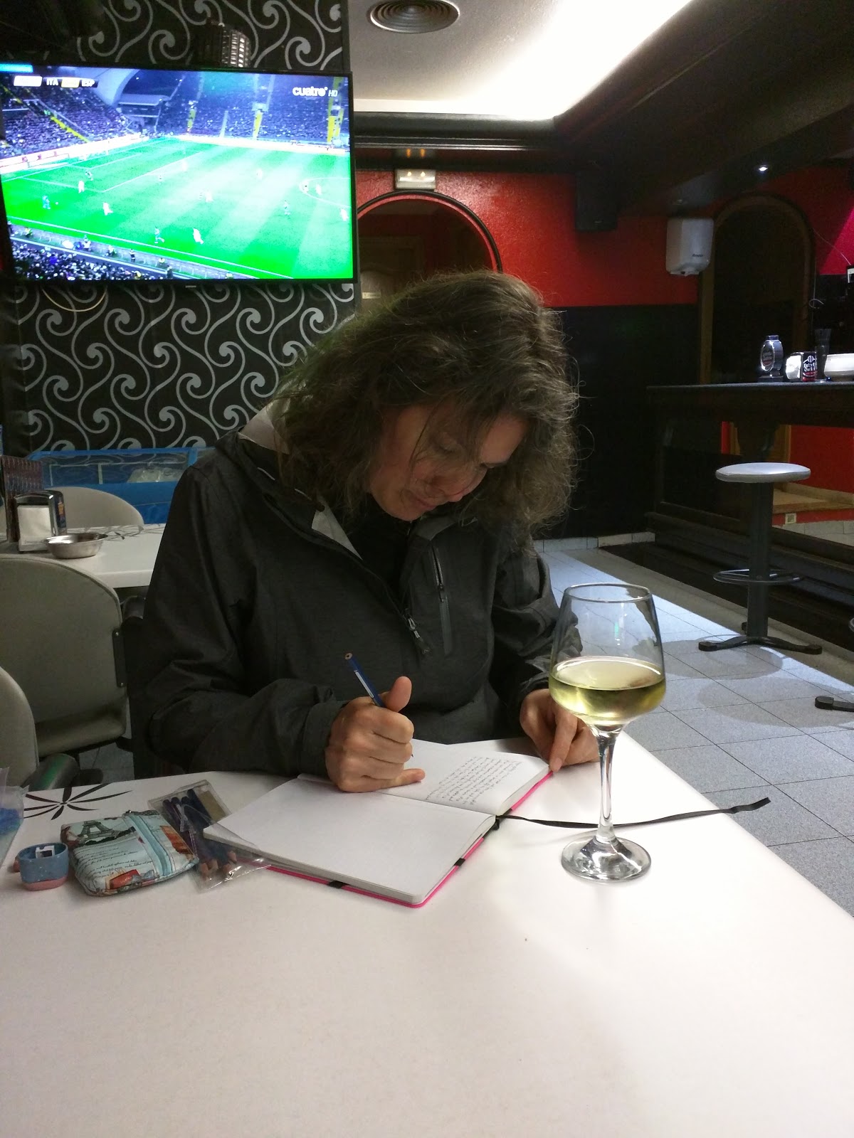 José and I decided to slip down to the restaurant next door while the clothes were washing and drying so he could continue watching the game. I brought my journal down with me so I could try to catch up. It’s been difficult to get any writing done in the evenings due to the lack of individual lights and Mia’s little flashlight got left in the second albergue by José on accident. I’m also writing twice as much trying to capture as many details as possible. It feels perfectly normal to be sitting here writing while enjoying a glass of white wine. The clothes on the other hand are a pain. The washing was just fine but the dryer is another one of those kind where you have to empty the water tray but that doesn’t seem to be functioning correctly because there is a huge puddle of water on the floor every time we go upstairs to check on them. By the time they were finished and folded, I was ready to crawl into bed with Mia again this time. José is occupying the bunk across from me, Erika and Justin are sharing again, and Mom gets a bunk to herself as well.Expenses: