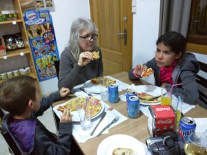 The innkeeper assigned us a room and told us we could pay and sign in when everyone else showed up. They like to check our passports and copy our info with everyone present.We were dripping water so the goal was to get everyone out of their wet clothes and try to get everyone dry. Mom showed up with Erika and Justin just over an hour later so we got checked in. There is a washer and dryer here but there is already a line of dirty laundry bags so we added ours to the line. We went downstairs to the “cafeteria” for dinner. There was already a group of young adults in there talking and laughing but we managed to get enough chairs around a table for our group. There is a menu here but it is all prepackaged food that the owner heats up and serves. So that means we dined on pizza and pasta tonight. It wasn’t actually that bad. The kids picked out cookies for their dessert. A girl poked her head into the room and told us that the washing machine had stopped so she took everything out of the washer and set it on top of the dryer. The kicker was when she told us all that she had put her clothes in the washer, even then we were all waiting in line with our own dirty clothes!! I was speechless and due to the hour, we just gathered up our clothes and decided to wear the same clothes tomorrow. I tried to take a shower tonight and the light in the upstairs bathroom flickered but it wouldn’t stay on. I wasn’t keen on bathing in the dark in a community bathroom.